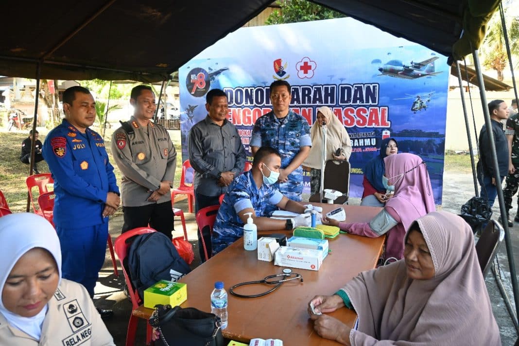 TKP Medan News.Com, Aceh Besar : Dalam rangka memperingati Hari Bakti ke-78 TNI Angkatan Udara, Lanud Sultan Iskandar Muda (SIM) menggelar kegiatan Bazar Pasar Murah, Donor Darah, dan Pengobatan Massal di halaman Kantor Camat Blang Bintang, Kamis (24/7/2025).