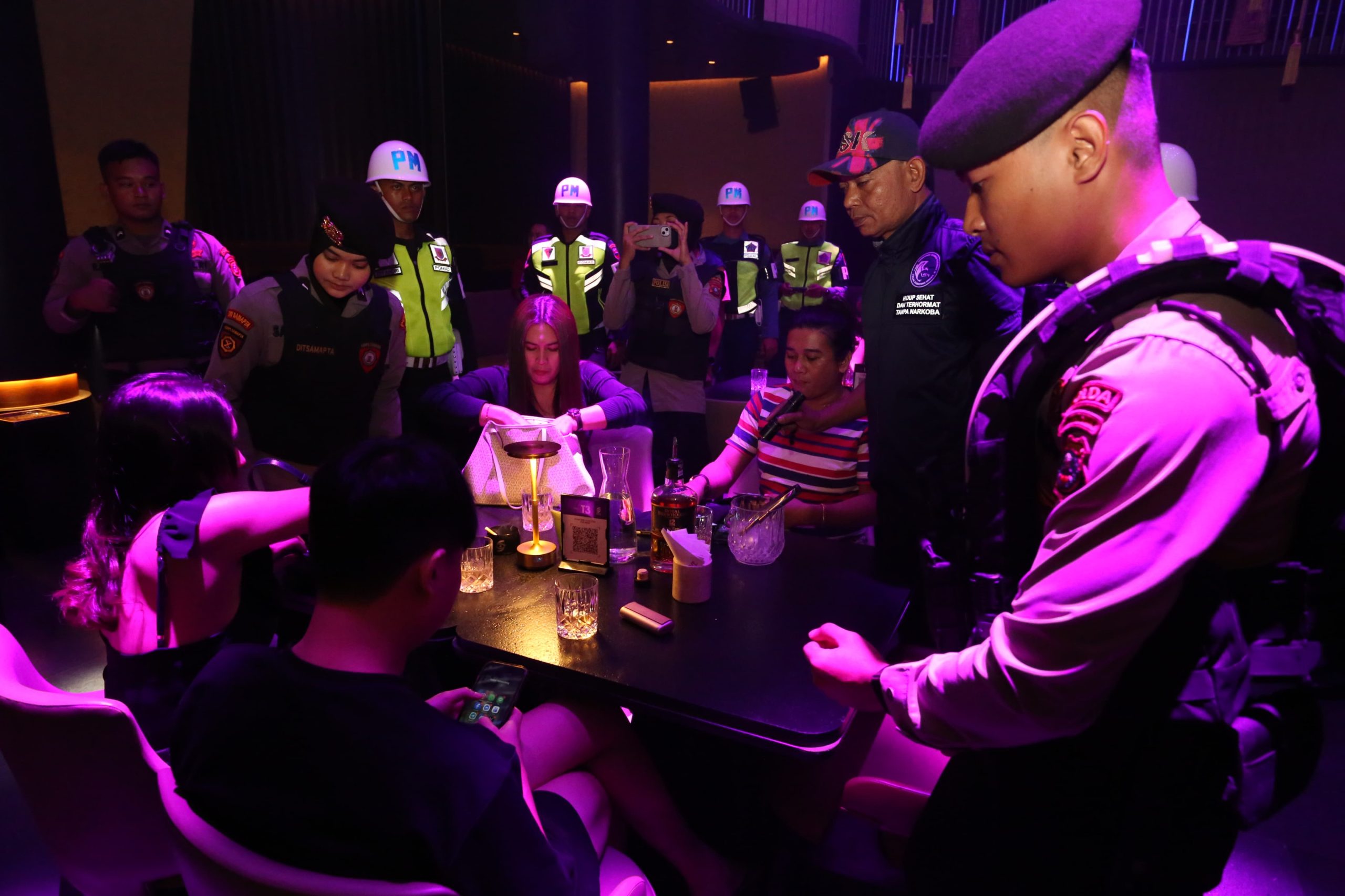 Di lokasi, petugas melakukan pemeriksaan terhadap pengunjung serta memantau area hiburan malam secara menyeluruh.